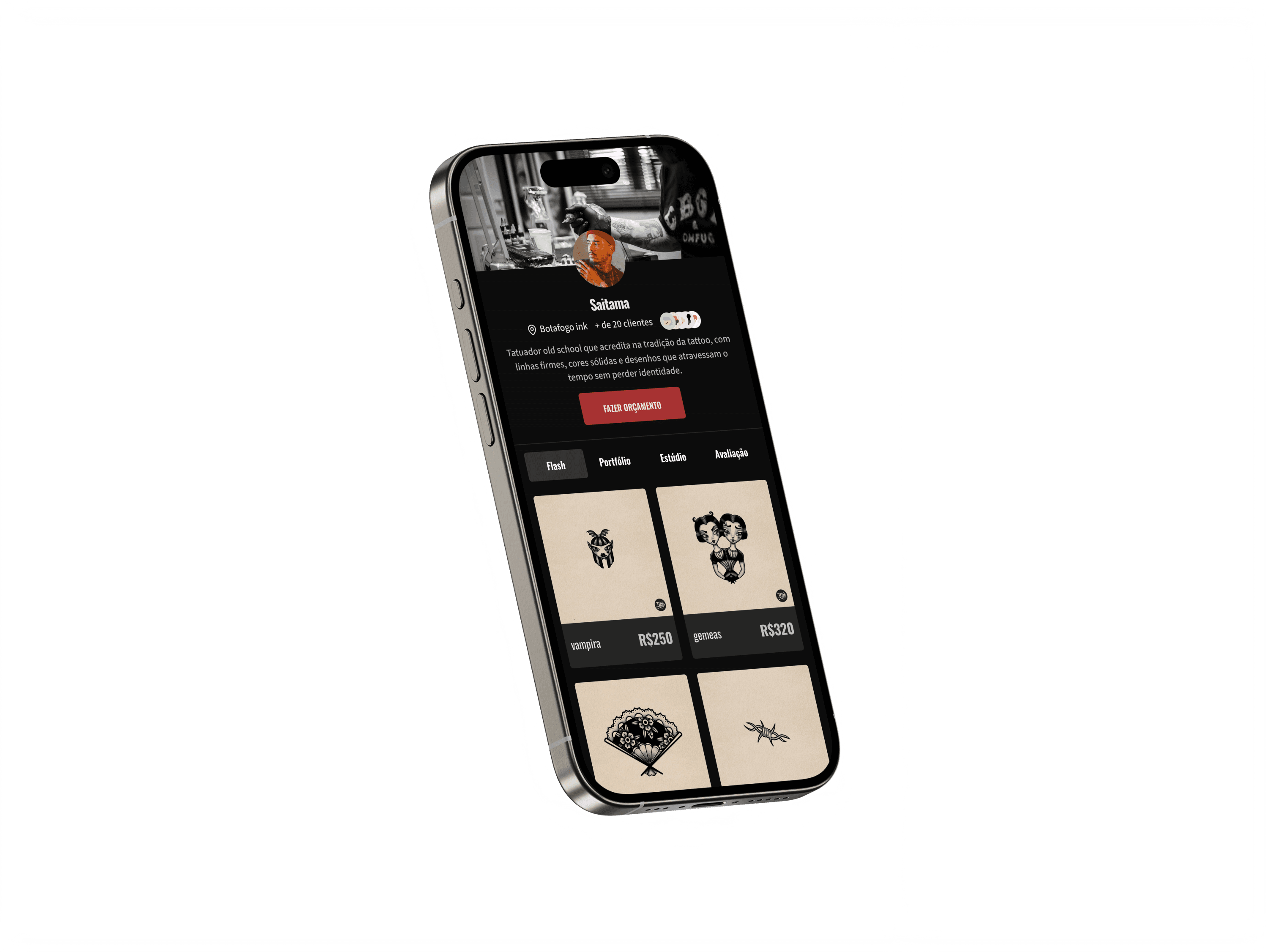 Seu perfil reúne tudo em um só lugar: flash, portfólio, avaliações e informações do estúdio. O cliente entende rápido e decide com mais segurança.