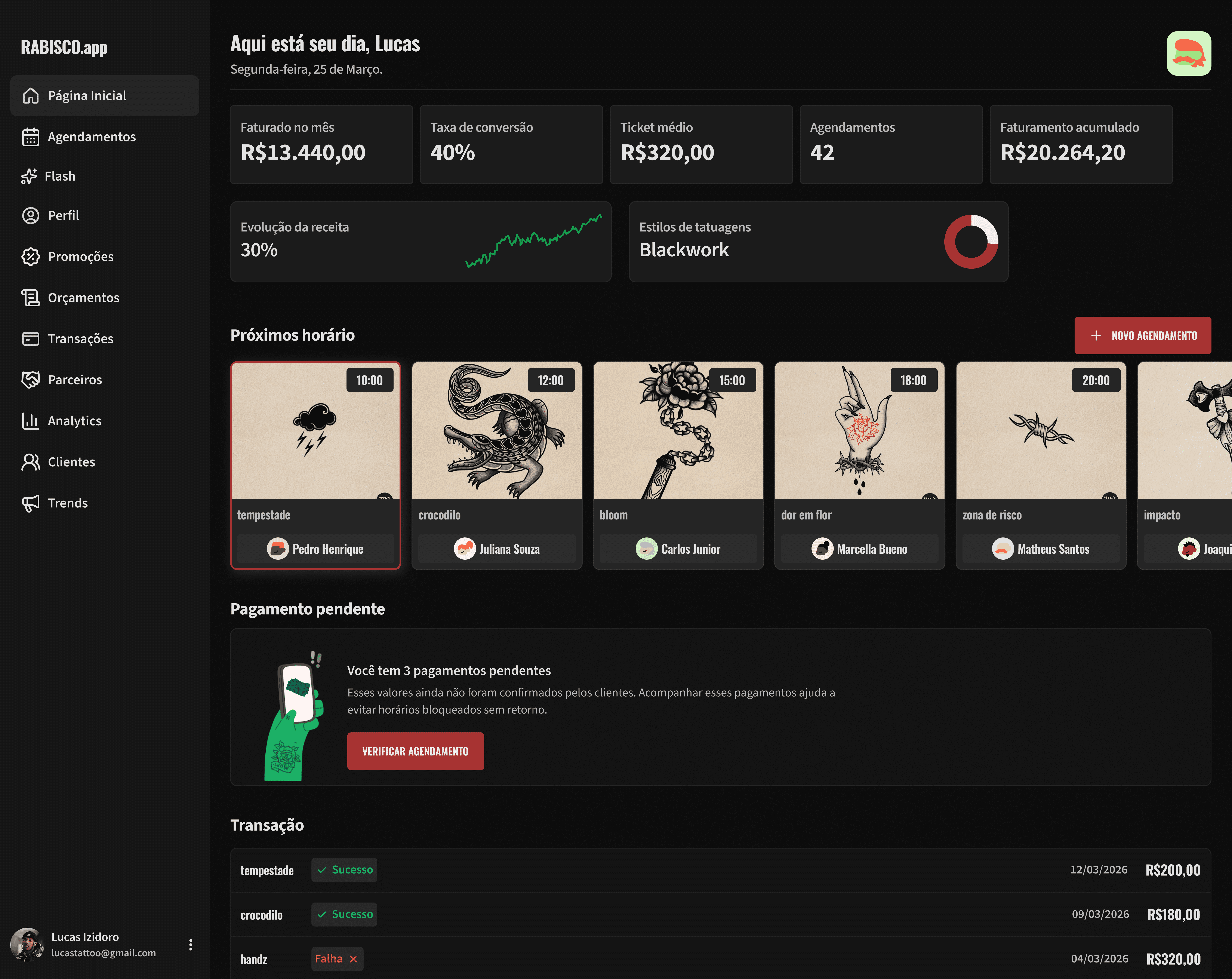 A Rabisco é uma ferramenta que organiza seu fluxo e transforma interesse em agendamento. A gente conecta seu perfil, sua agenda e seus clientes em um só lugar, sem depender de conversa para fechar. Mais do que isso, foi criada para ajudar no crescimento do tatuador, trazendo mais controle, ocupação e previsibilidade.